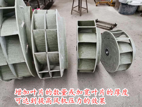 加大葉片的寬度、厚度以及調整葉片的弧度都可不同程度的提高風壓,如本公司生產的玻璃鋼高壓風機就是通過噶便葉輪的規格來達到使用標準。
