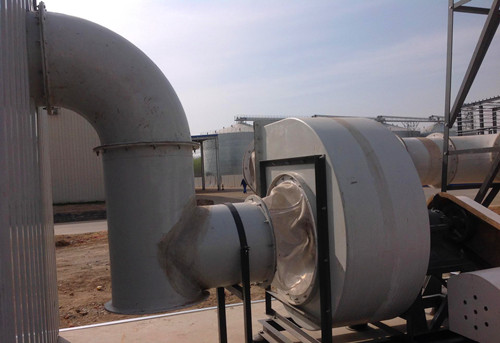 從圖中可以看出有一些風機的出風口是與煙囪直接連接的,故而不需要使用軟連接。軟連接多用于風機的進風口與管道之間。軟連接在風機工作時可起到緩沖的作用,減小風機與管道彼此之間的影響。同時也方便風機的安裝拆卸以及日常的維護工作。